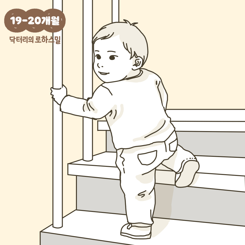 19~20개월의 아이들은 난간을 잡고 계단을 오를 수 있습니다. 처음에는 한발을 한 계단 안에 올리고 나머지 발을 올려 두발을 모아 다시 다음 계단에 다른 발을 올리는 식으로 올라가게 됩니다.
