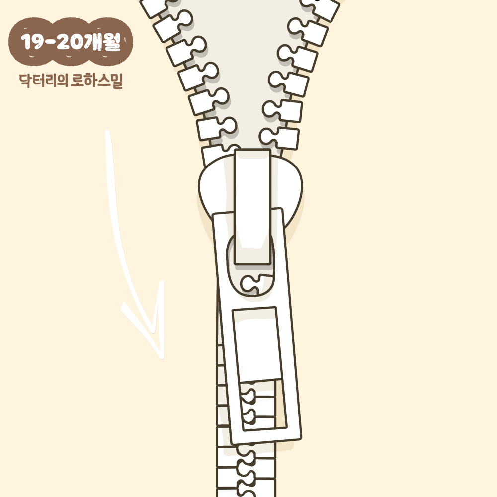 19~20개월의 아기들은 지퍼를 열 수 있습니다. 지퍼를 열고 닫는 것을 가르쳐 주고, 옷이나 가방 등에 부착되어 있는 지퍼를 보여주면서 설명해 주는 것도 좋은 교육이 됩니다.