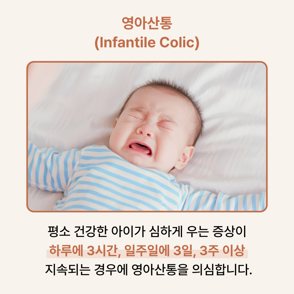 영아산통(Infantile Colic)이 있는 아이들은, 달래지지 않을 정도로 심하게 울곤 합니다. 주로 생후 3주쯤부터 3개월 정도 된 아이들에게 종종 보이는데, 소아과 의사들은 ‘3의 법칙’으로 진단하기도 합니다.