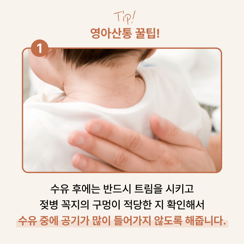 1. 수유 후에는 반드시 트림을 시키고, 젖병 꼭지의 구멍이 적당한 지 확인해서 수유 중에 공기가 많이 들어가지 않도록 해줍니다. 공기가 적게 들어가도록 설계된 젖꼭지를 사용하기도 합니다.