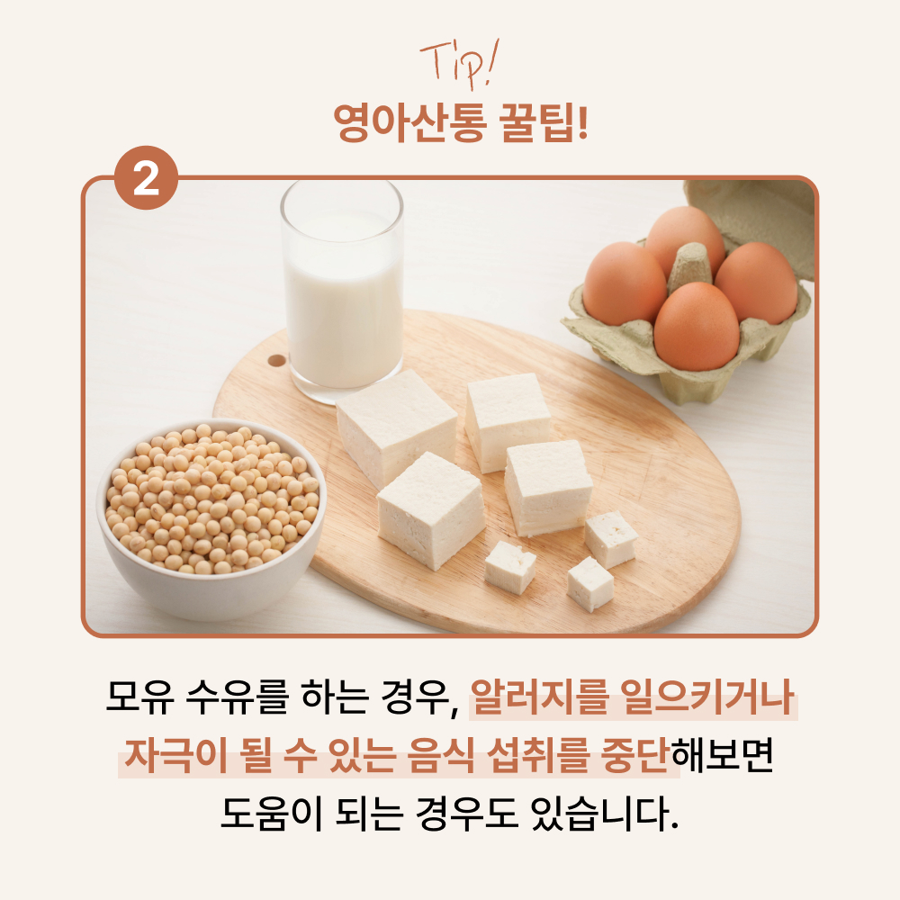 2. 일부(약 5% 미만)의 아이들은 음식 때문인 경우가 있습니다. 모유 수유를 하는 경우 한시적(1-2주 정도)으로 알레르기를 일으키는 음식(유제품, 계란 등)이나 자극이 될 수 있는 음식(매운 음식) 섭취를 중단해 보면 도움이 되는 경우도 있습니다. 분유 수유의 경우 배앓이용 분유 또는 알레르기 분유로 바꾸면 도움이 되기도 합니다.