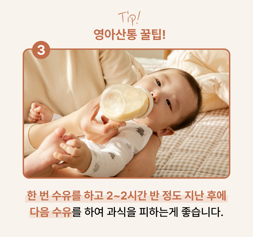 3. 과식은 피해야 합니다. 한번 수유를 하고 2~2.5시간 정도 지난 후에 다음 수유를 하는 것이 좋습니다. 현실에서는 수유한 지 얼마 지나지 않았는데 아이가 보채서 다시 수유를 하는 경우가 종종 있는데요, 아이가 속이 불편해서 보채는 건데도 배가 고픈 줄로 잘못 알고 수유를 하면 배앓이가 심해지기도 하지요.