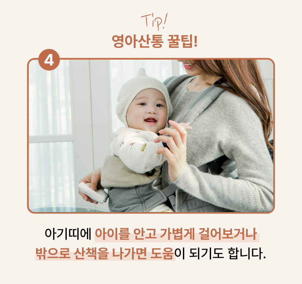 4. 아기 띠에 아이를 안고 가볍게 걸어보거나 밖으로 산책을 나가면 도움이 되기도 합니다.