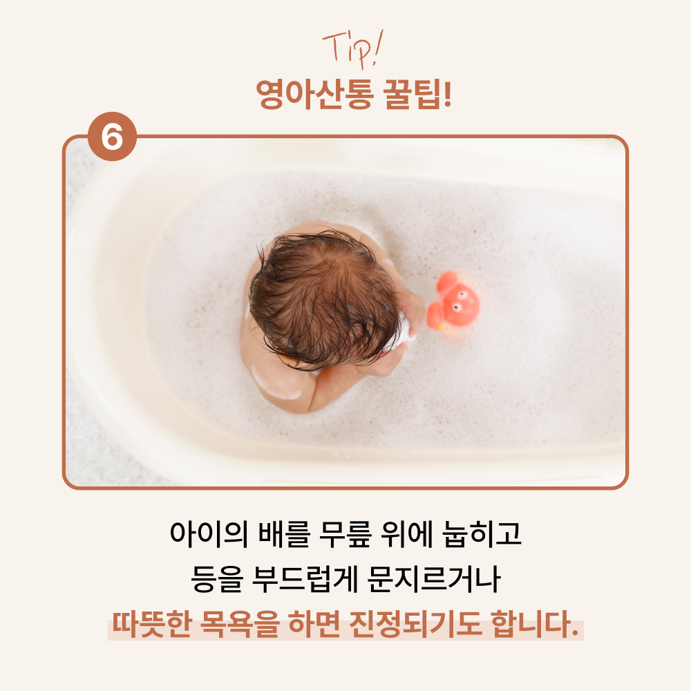 6. 아이의 배를 무릎 위에 눕히고 등을 부드럽게 문질러 주거나 따뜻한 목욕을 하면 진정되기도 합니다.