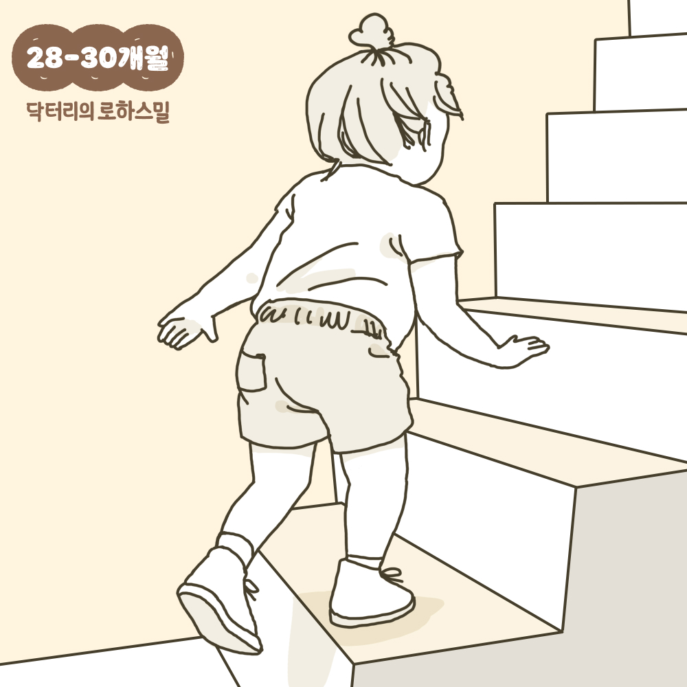 28~30개월의 아이들은 난간을 잡지 않고 계단을 올라갈 수 있습니다. 처음에는 한 계단에 양발을 모아 다시 한 발을 내딛는 식으로 계단을 올라가게 됩니다. 아이들에게 계단을 올라 높은 곳에 있다는 느낌은 또 다른 성취감을 줄 수 있습니다.