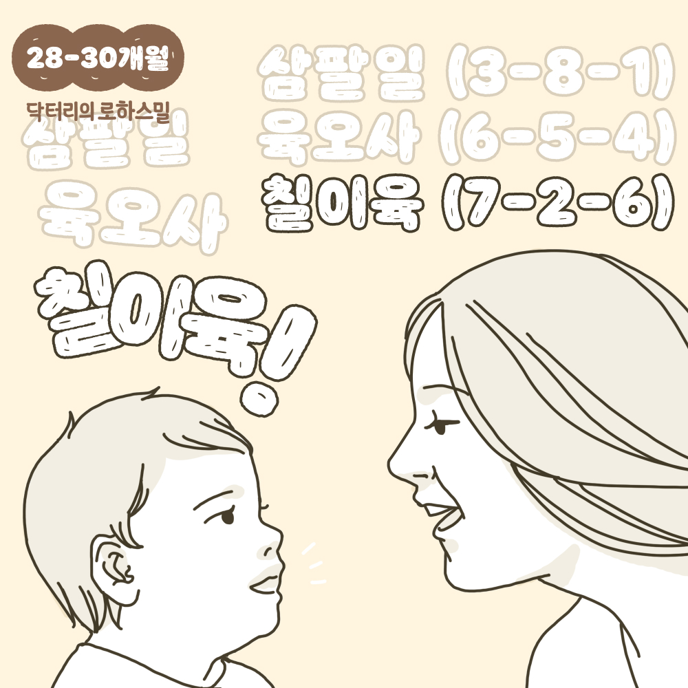 28~30개월의 아기들은 2개의 숫자를 따라 말할 수 있습니다. 예를 들어 삼팔(3, 8), 육오(6, 5), 칠이(7, 2) 라고 한 번에 두 개의 숫자를 이야기하고 아이에게 따라해 보라고 합니다. 이 시기의 아이들은 3번 중 2번 정도는 제대로 따라할 수 있습니다.