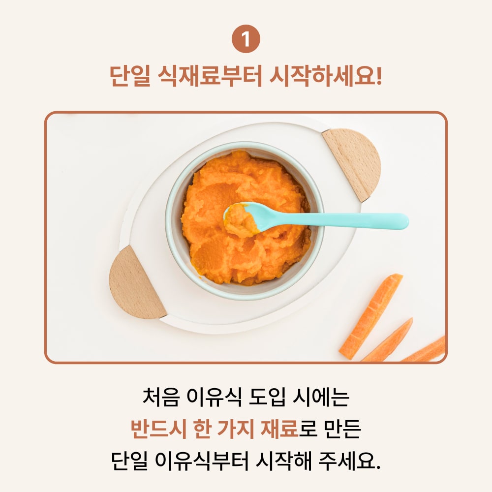 처음 이유식 도입 시에는 반드시 한 가지 재료로 만든 이유식부터 시작해주세요. 혼합재료는 알러지 반응 발생 시 어떤 재료가 원인인지 파악하기 어렵습니다.