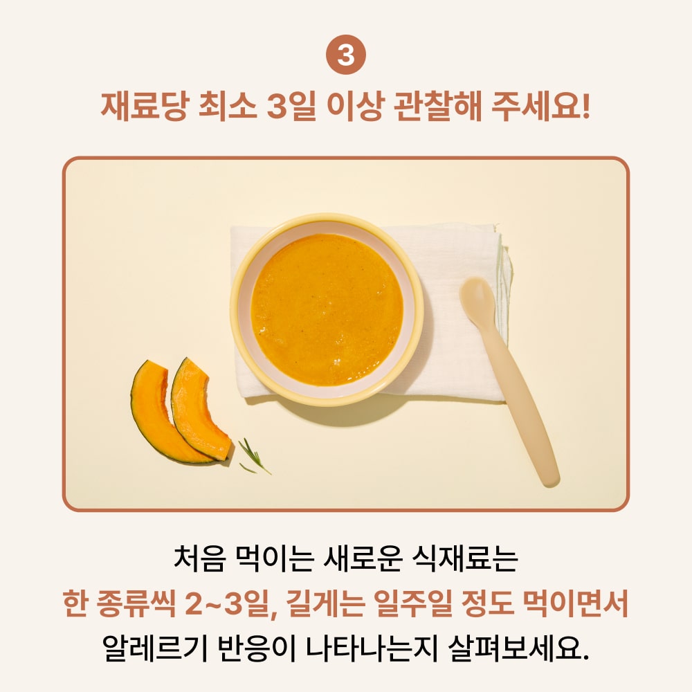 새로운 식재료당 최소 2~3일, 길게는 일주일 정도 먹여 보세요. 피부발진, 구토, 설사, 기침 등이 생기지 않는지 확인하세요. 이 과정을 ‘3일 테스트 법칙’ 이라고 합니다.