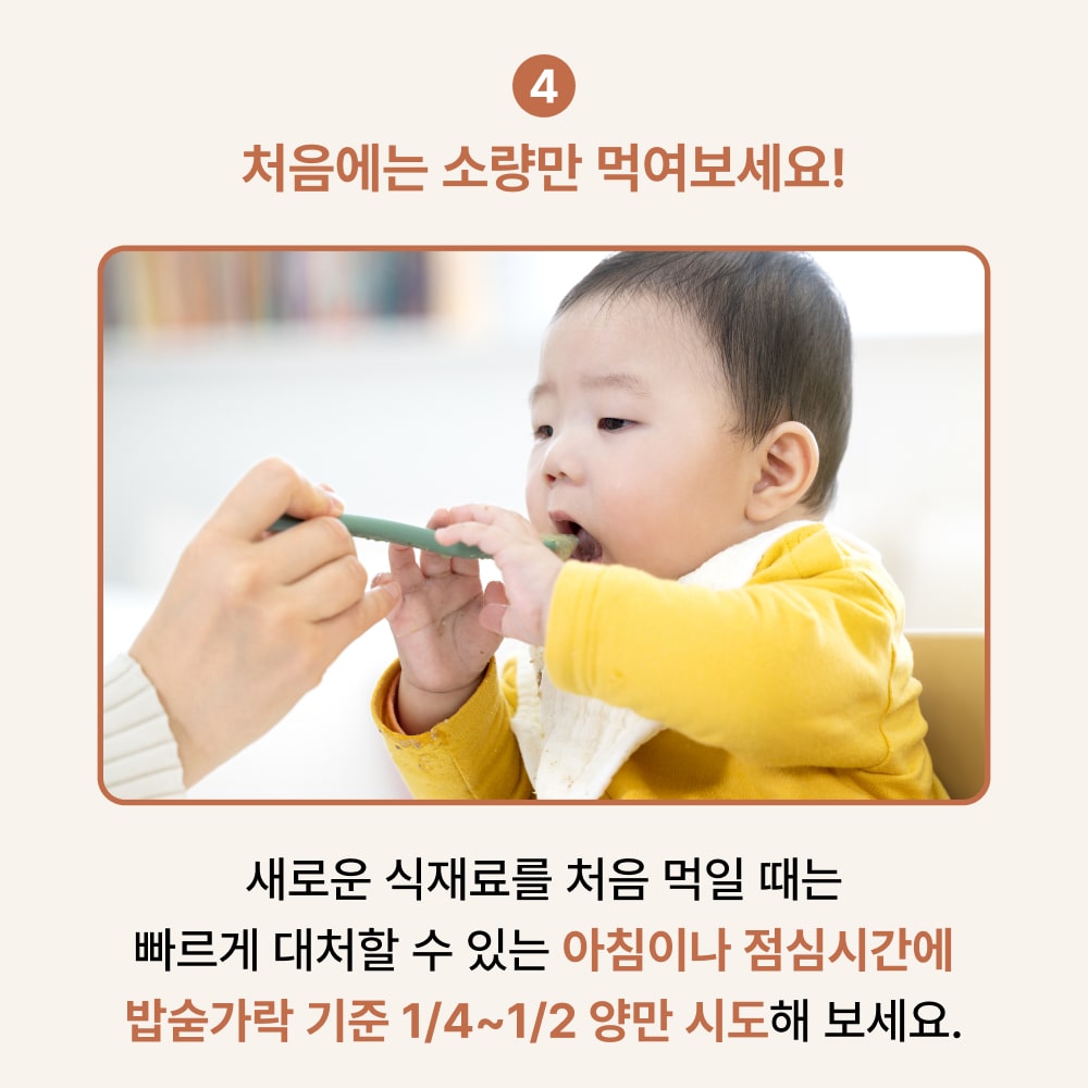 새로운 식재료를 처음 먹일 때는 밥숟가락 기준 1/4~1/2 양만 시도해 보세요. 계란 흰자, 땅콩처럼 특히 알러지가 잘 생기는 음식은 더 적은 양으로 시도해보는 것이 좋습니다.