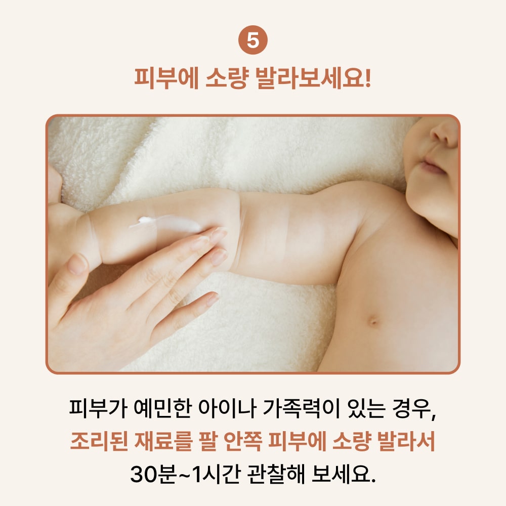 피부가 예민한 아기나 가족력이 있는 경우엔, 조리된 재료를 아기 팔 안쪽 피부에 소량 발라 30분~1시간 관찰해 보세요. 붉음, 부종, 두드러기 반응이 나타나면 해당 식품은 보류하는 것이 좋습니다.