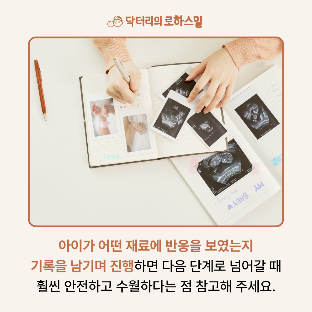 아기가 어떤 재료에 반응을 보였는지 기록을 남기며 진행하면 다음 단계로 넘어갈 때 훨씬 안전하고 수월하다는 점 참고해 주세요.