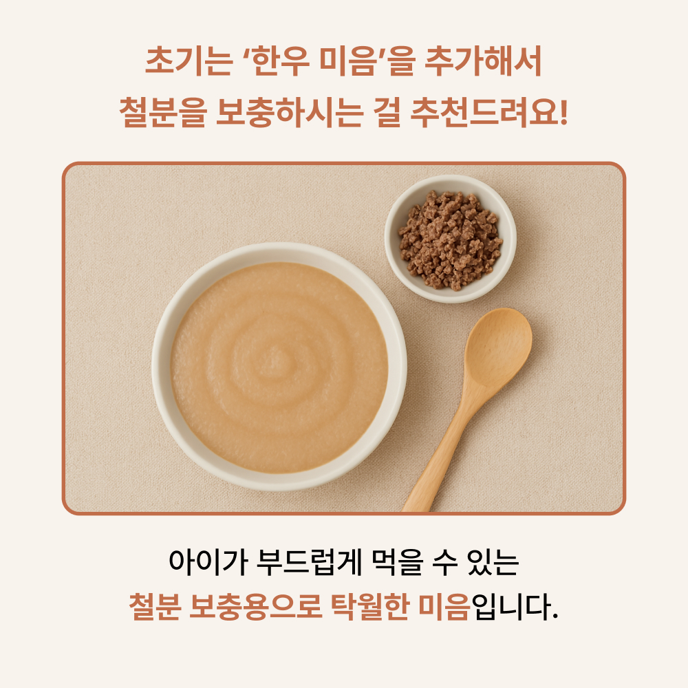 초기에는 한우 미음을 추가로 주문해서 철분을 보충해주시는걸 추천드립니다. 한우미음은 아이가 부드럽게 받아들이고, 철분을 흡수하기도 좋습니다.