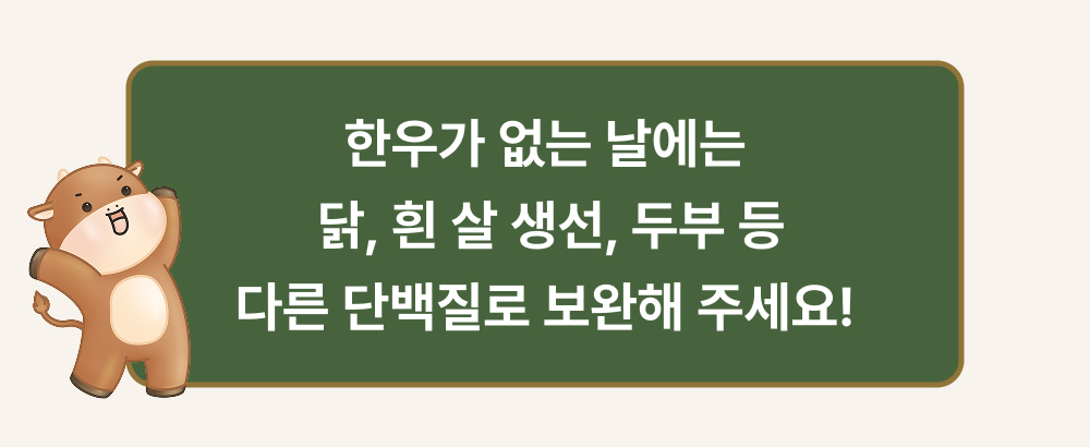 한우가 없는 날은 닭, 흰 살 생선, 두부 등 다른 단백질 식품을 보완해 주셔도 괜찮습니다. 다만, 철분 보충용으로는 한우가 가장 이상적입니다.