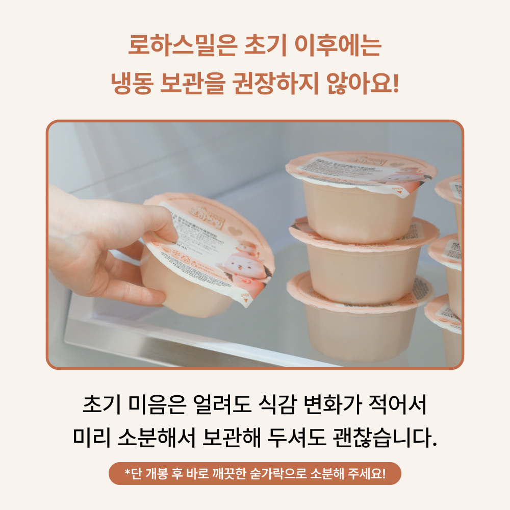 로하스밀은 초기 이후의 이유식은 냉동 보관을 권장하지 않으며 이유식의 영양소와 맛, 안전성을 최우선으로 하기 때문에 개봉 후 24시간 이내 섭취를 권장 드립니다.