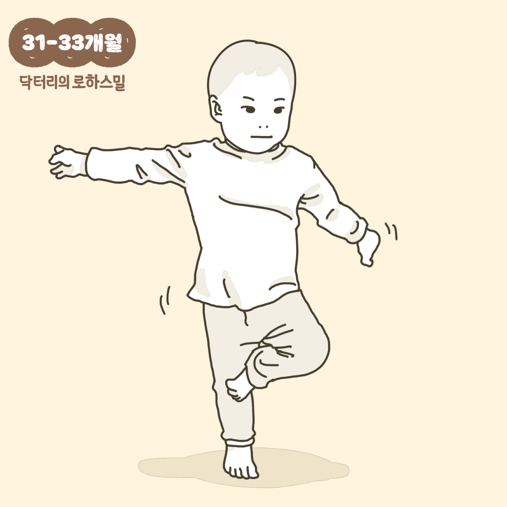 31~33개월의 아이들은 한발로 1초 동안 서 있을 수 있습니다.