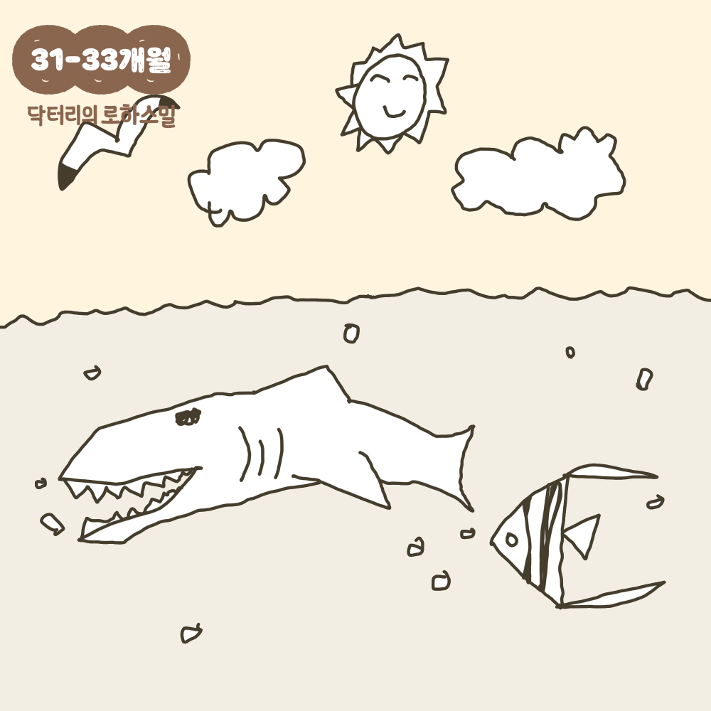 31~33개월의 아이들은 수평선을 흉내 내어 그릴 수 있습니다. 그림을 그릴 때 바다와 하늘이 닿는 곳, 혹은 땅과 하늘이 닿는 곳에 대한 표현을 하게 됩니다.