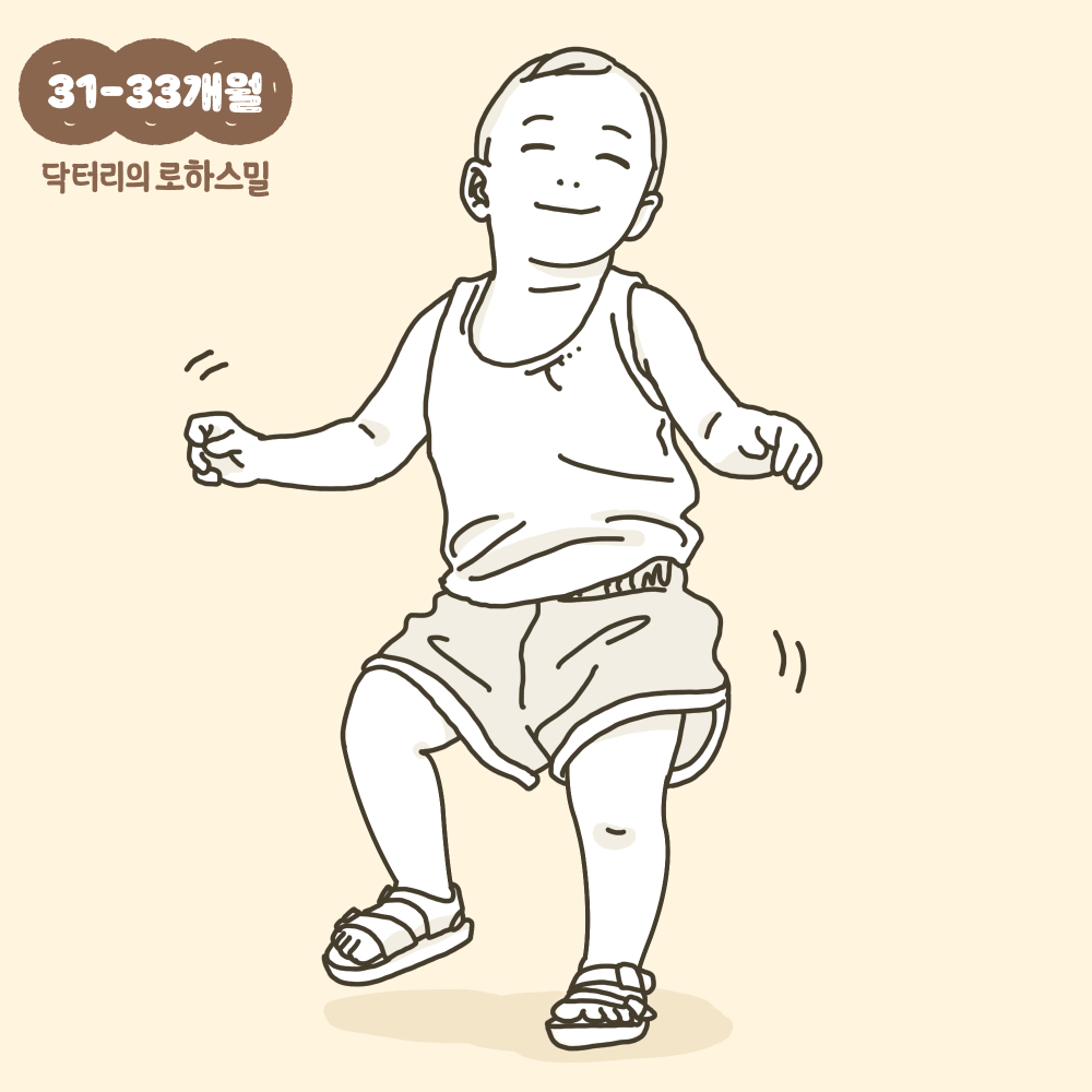31~33개월의 아기들은 일어서서 자신의 팔다리를 원하는 대로 자유로이 움직이는 것이 가능해집니다. 따라서 음악소리에 춤을 추거나 몸을 흔들며 반응을 보일 수 있습니다.