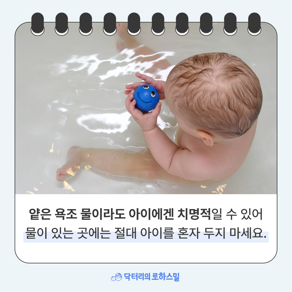깊은 물이 위험한 건 누구나 알고 있지만, 사실 5~10cm 정도의 얕은 욕조 물도 아이에겐 치명적일 수 있습니다. 걸음마를 막 배우기 시작한 아이가 욕조 안에서 미끄러져 넘어졌고, 엎어진 상태에서 혼자 일어나지 못해 변을 당한 안타까운 사고도 있었어요.