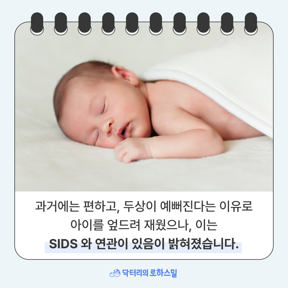 오늘은 아이의 수면자세에 얽힌 짧은 이야기를 나눠볼까 합니다. 한때는 아이를 엎드려 재우는 것이 당연하게 여겨지던 시절이 있었습니다. 아이가 더 편안하게 잘 수 있고, 두상도 예쁘게 자랄 거라는 믿음 때문이었지요.