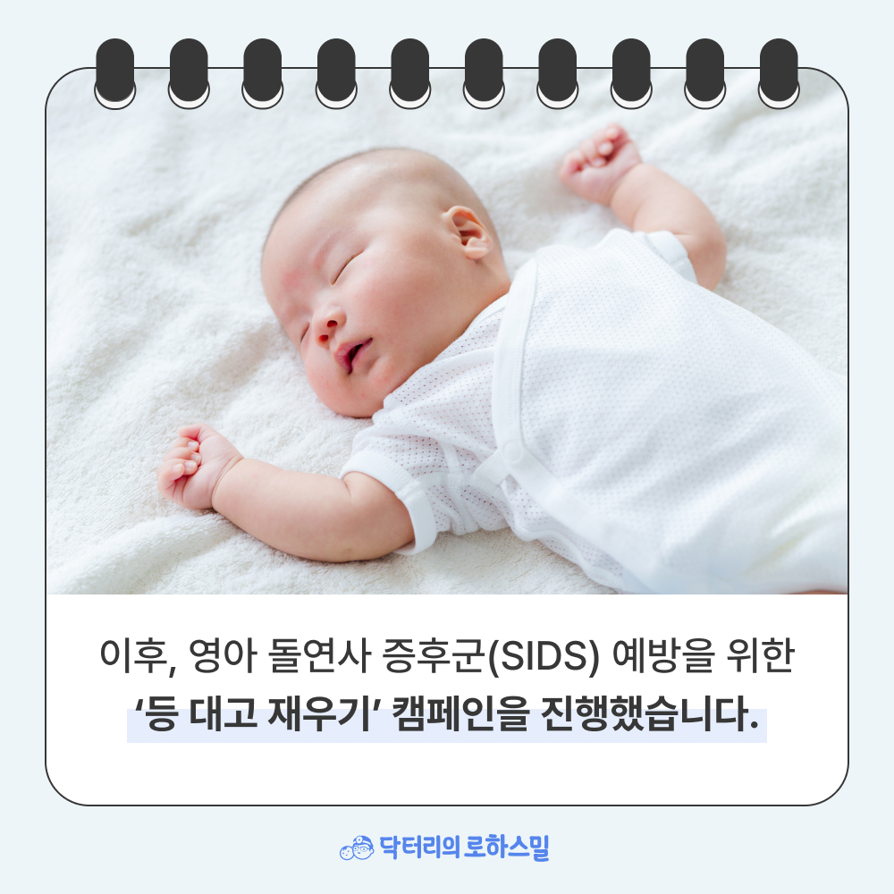 이후 많은 나라에서 ‘등을 대고 재우기(Back to Sleep)’캠페인이 시작되었고, 이 덕분에 전 세계적으로 SIDS 발생률이 눈에 띄게 줄어들게 되었지요.