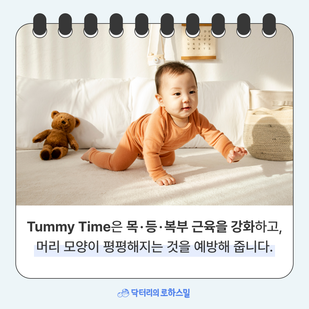 이 시간은 아이의 목과 등, 복부 근육을 단련시켜줄 뿐만 아니라, 머리 모양이 평평해지는 것도 예방해줍니다.