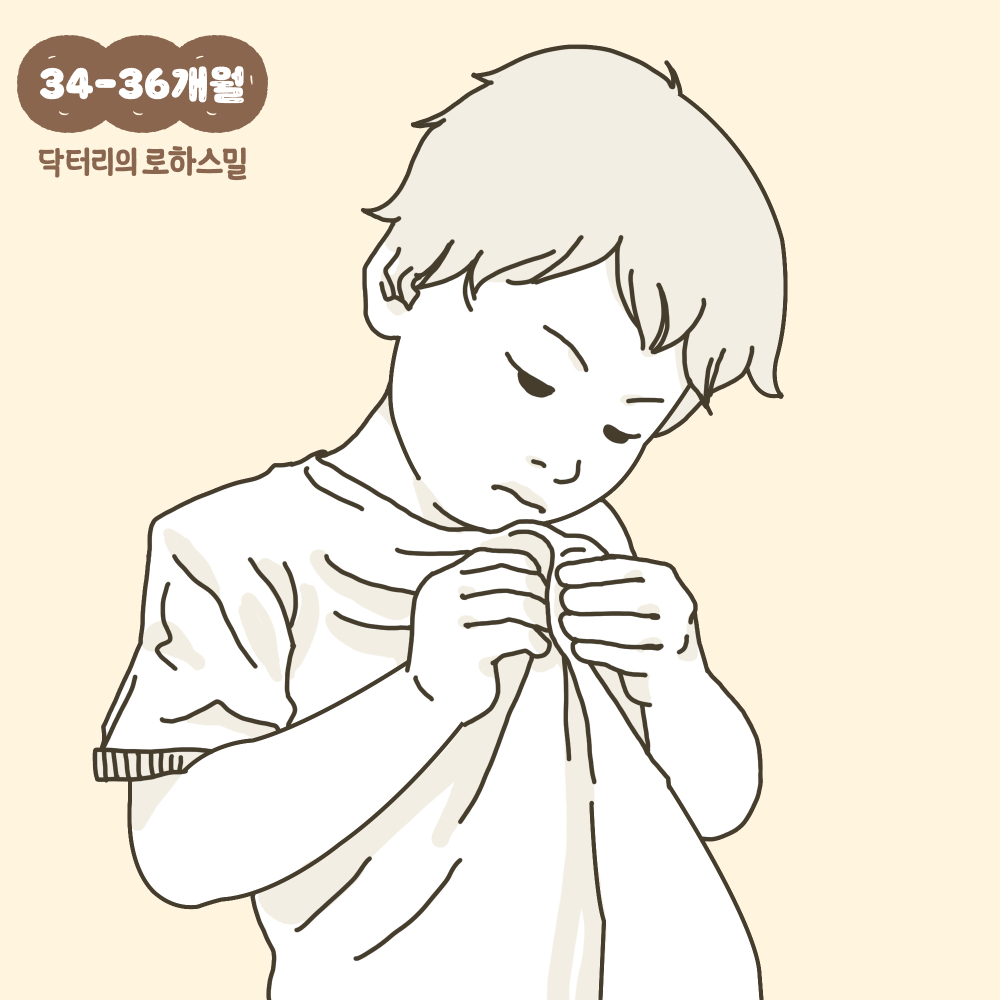 34~36개월의 아이들은 단추를 풀 수 있습니다. 옷에 있는 단추를 혼자 풀어볼 수 있게 도와주세요. 단추를 혼자 푸는 동작은 자신의 옷을 벗고 입는 개인-사회성 영역뿐 아니라 손가락을 움직이는 미세운동 발달에도 도움이 됩니다.