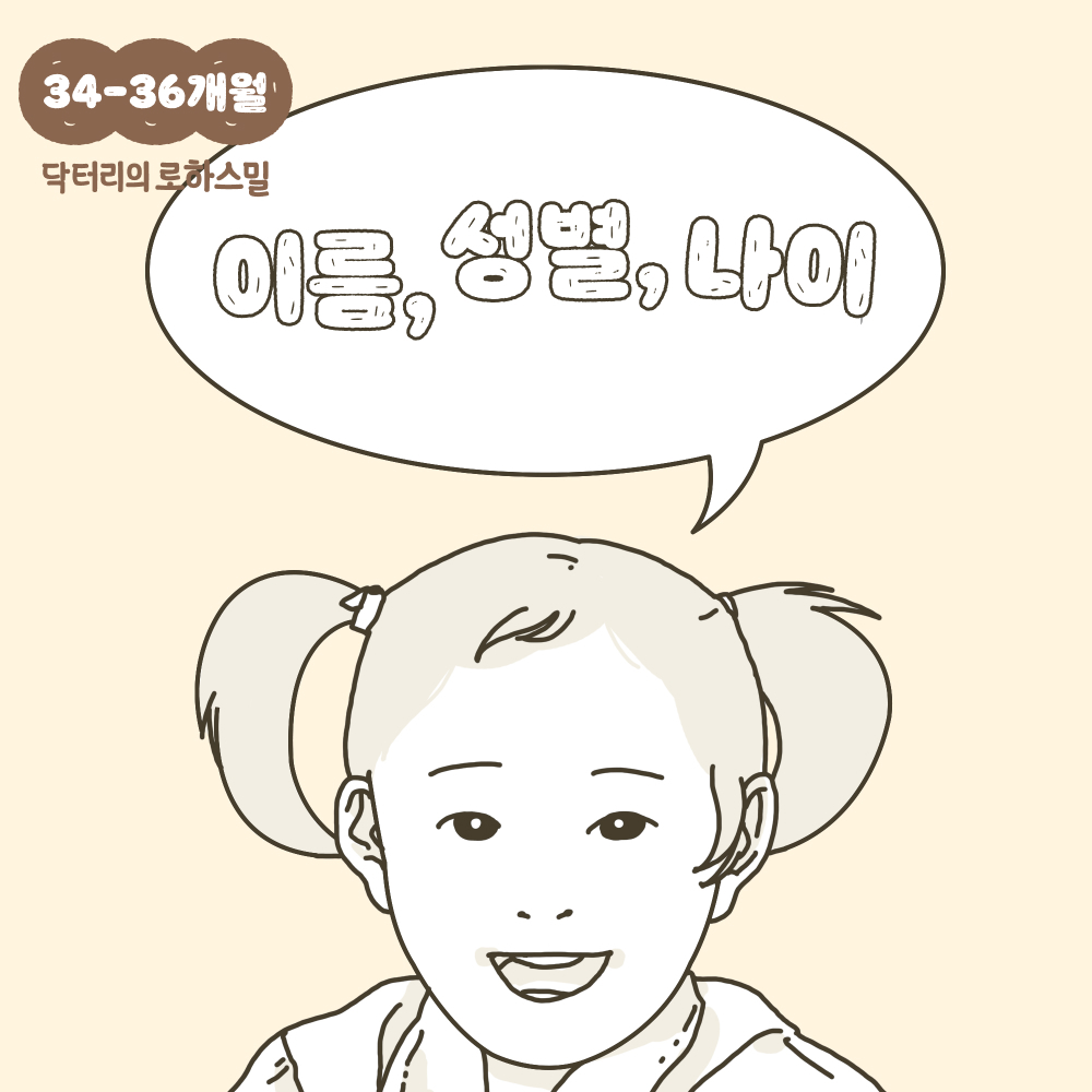 34~36개월의 아이들은 이름, 성별, 나이를 이야기합니다. 이시기의 아이들은 자신을 부모로 부터 독립적인 개체로 생각하려고 하고, 자신에 대한 독자성을 확인하려고 합니다. 그 과정 중에서 엄마, 아빠 말을 잘 안 듣는듯한 행동들이 나타날 수도 있습니다.