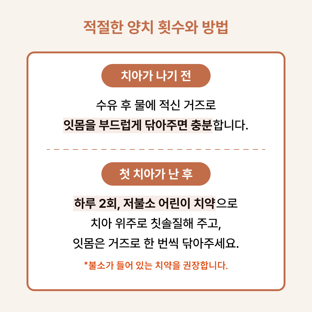 - 치아가 나기 전 → 수유 후 물에 적신 거즈로 잇몸을 부드럽게 닦아주면 충분합니다.