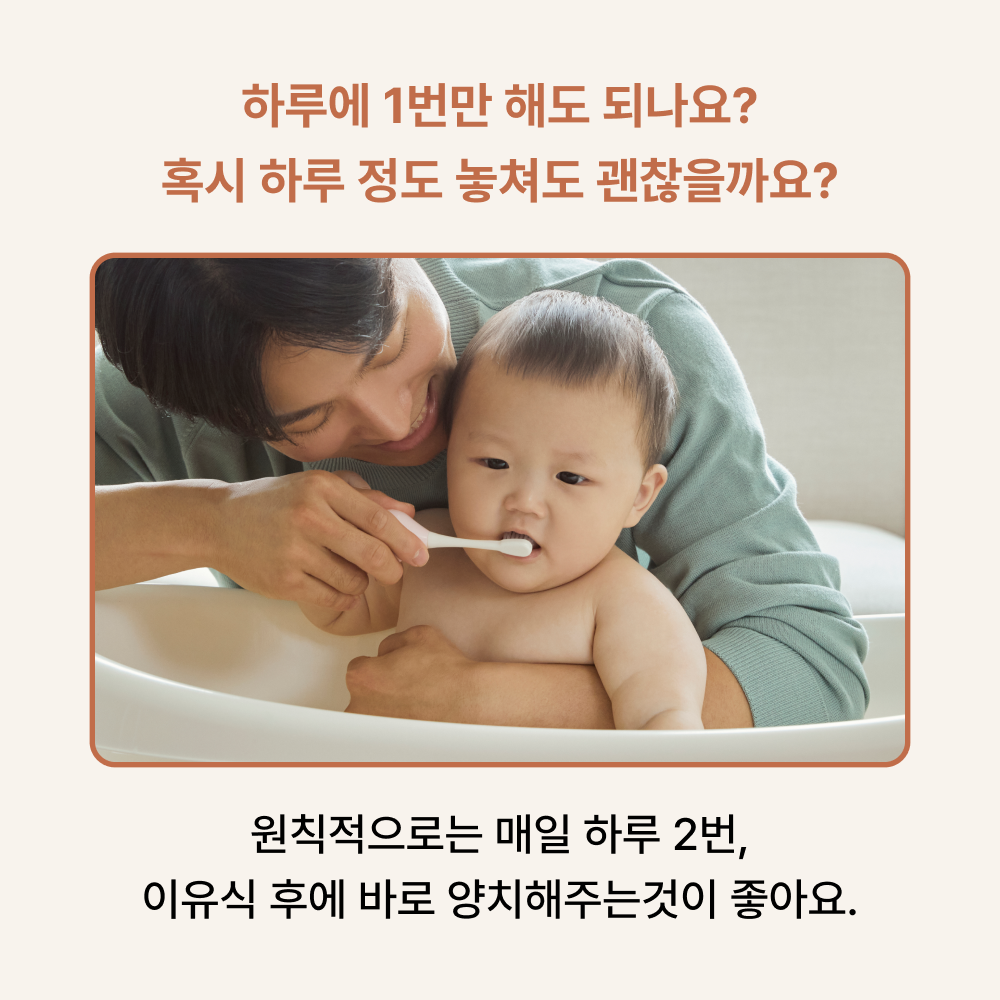 원칙적으로는 매일 하루 2번, 이유식 후에 바로 양치해주는것이 좋아요. 꾸준히 해주는것을 권장하지만, 한 번씩 빼먹는다고 큰일 나진 않으니 너무 부담 갖지 마세요.