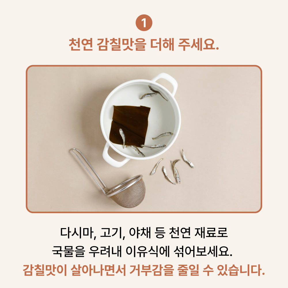 다시마, 고기 육수 같은 천연 재료를 우려내 국물을 조금 섞어보세요. 음식 자체에 감칠맛이 살아나면서 거부감을 줄일 수 있습니다.