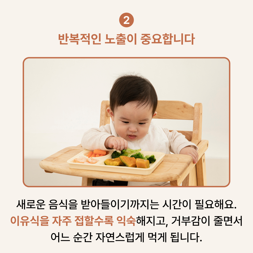 아이가 처음에는 거부하더라도, 자주 접하게 해주는 것이 중요합니다. 아이가 새로운 음식을 받아들이기까지는 시간이 필요합니다. 자주 접할수록 익숙해지고, 거부감이 줄어들면서 어느 순간 자연스럽게 먹게 됩니다.