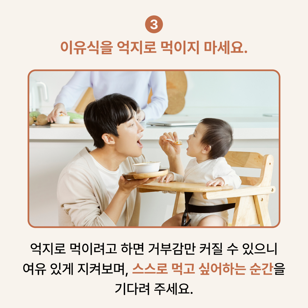 가장 중요한 것은 억지로 먹이지 않는 것입니다. 억지로 먹이면 음식에 대한 거부감만 더 커질 수 있으니 부모가 여유 있게 지켜보며, 아이 스스로 먹고 싶어하는 순간을 기다려 주세요.