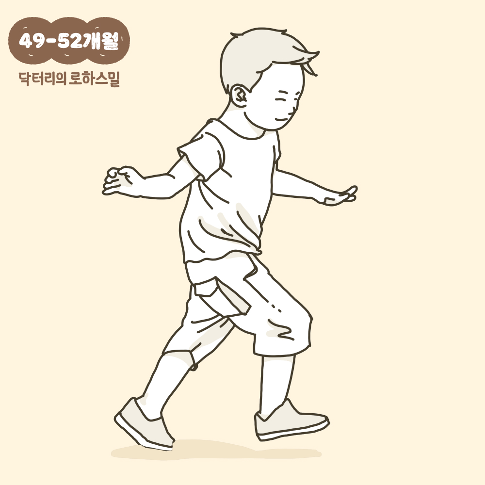 49~52개월의 아이들은 번갈아 가며 한쪽 발로 껑충껑충 뛰어갑니다. 줄넘기도 한번 정도는 할 수 있습니다.