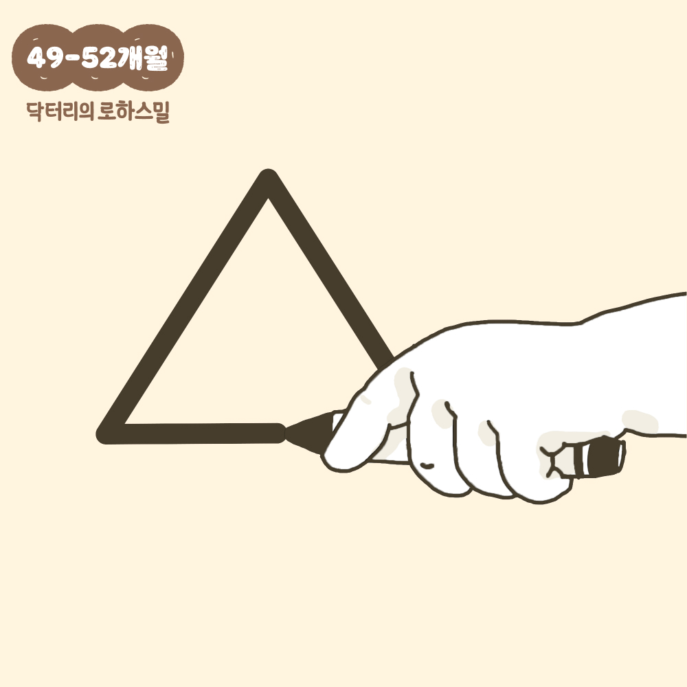 49~52개월의 아이들은 삼각형을 보고 그릴 수 있습니다. 비뚤비뚤하게 그리더라도 격려해주시고 천천히 세 점을 잇도록 가르쳐주세요.