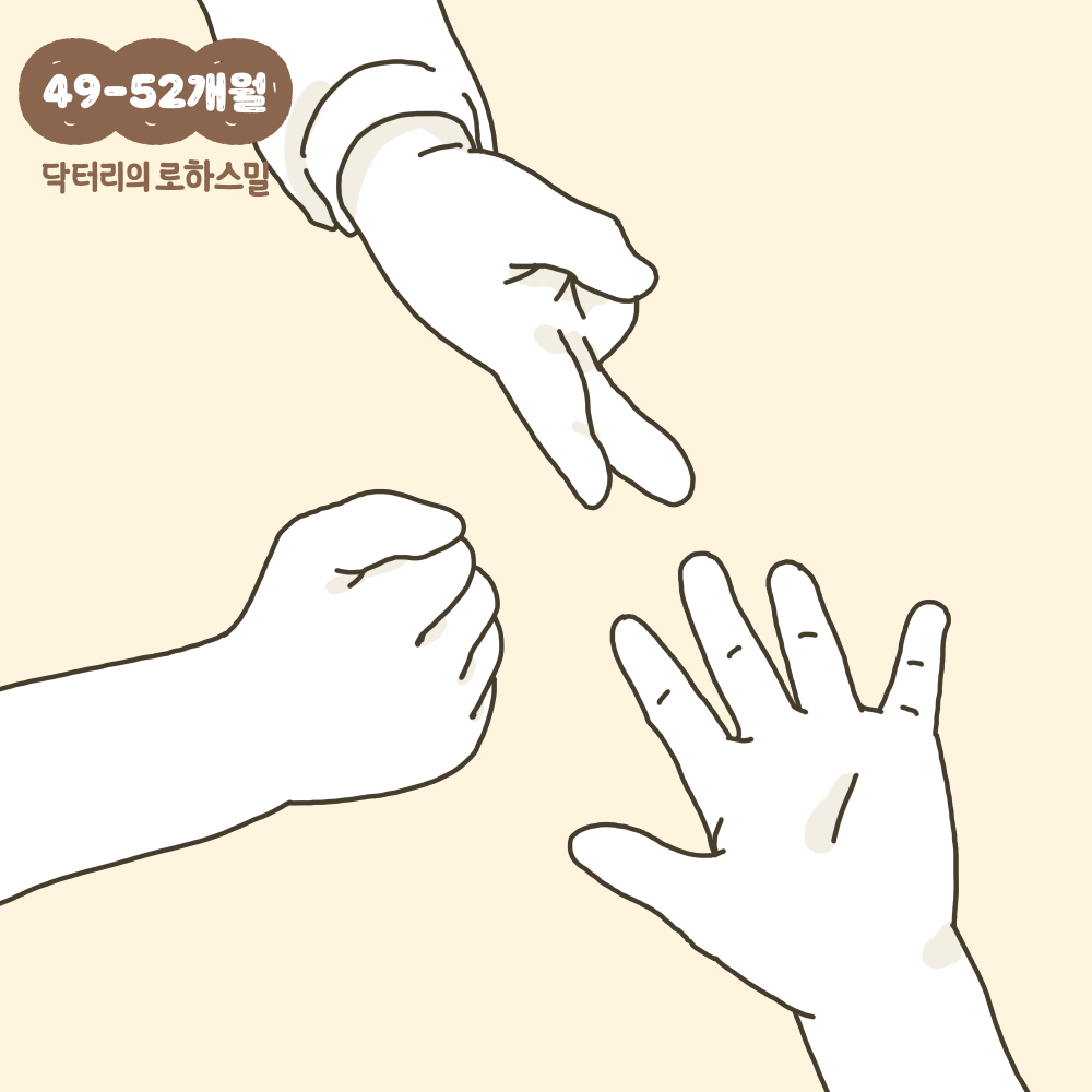 49~52개월의 아기들은 가위바위보로 놀이를 할 수 있습니다. 가위가 보자기를 이기고, 바위가 가위를 이긴다는 설명을 아이에게 천천히 설명해 주세요. 가위바위보에 익숙해지면 친구들끼리 가위바위보로 순서를 정해서 놀 수 있습니다.