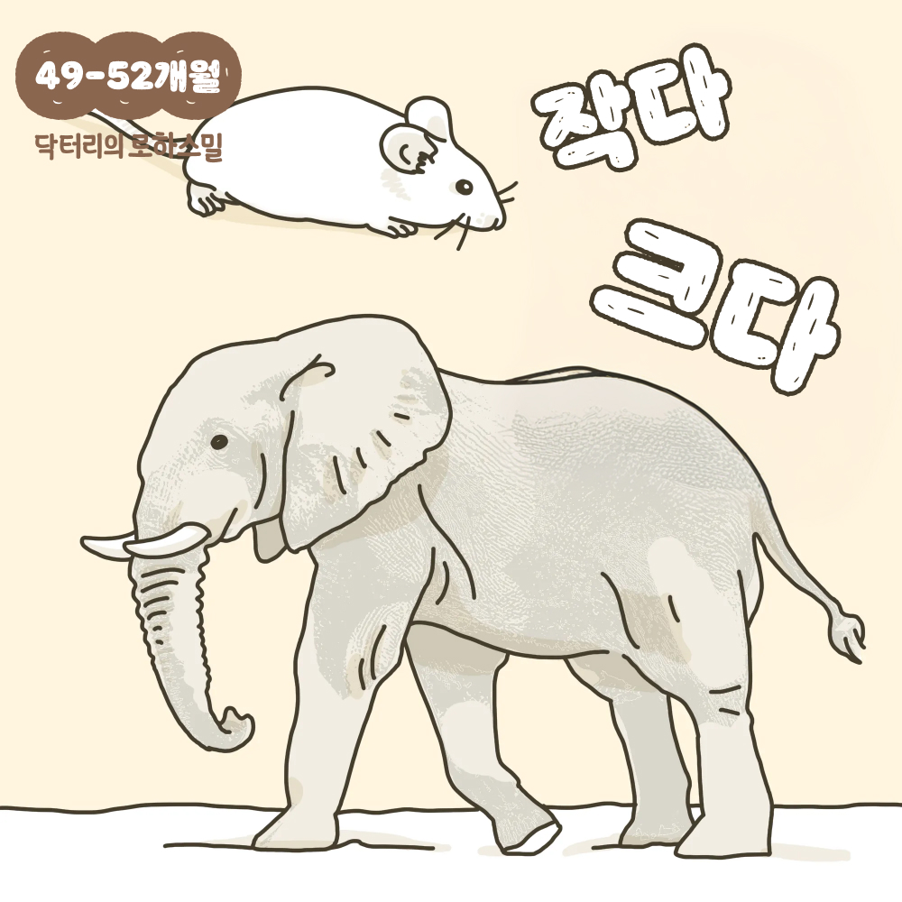 49~52개월의 아기들은 반대말을 알 수 있습니다. 큰 것과 작은 것, 남자와 여자, 긴 것과 짧은 것들을 알 수 있습니다. 아이와 함께 퀴즈를 내고 맞춰보는 연습을 해보세요. 예를 들면 코끼리는 크고 생쥐는 ( ). 엄마는 여자 아빠는 ( ) 등의 문제를 맞출 수 있습니다.