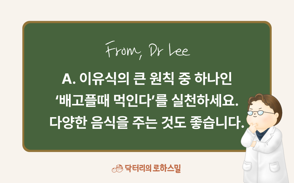 A. 이유식의 큰 원칙 중 하나인 '배고플때 먹인다'를 실천하세요.
