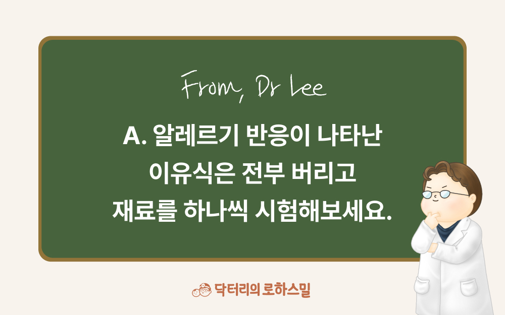 추천드리고 싶은 것은 알레르기 반응이 좋아질 때까지 1주일 정도는 수고스러우시더라도 어머니께서 이유식을 만드시면서 이번에 들어있던 음식들을 하나씩 추가해 보시는 것입니다. 이렇게 직접적으로 확인하는 방법이 가장 정확한 방법이지만, 위에 말씀드렸듯이 이렇게 해도 원인을 찾지 못할 수도 있습니다.