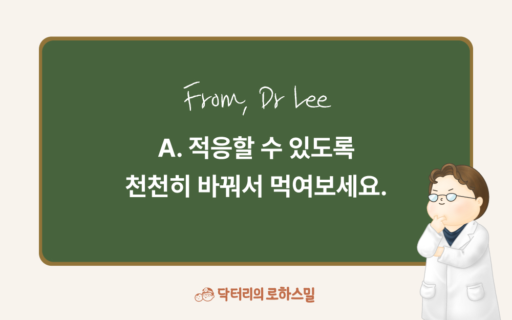 A. 초기 이유식을 하던 시간에 천천히 바꿔서 먹이시면 됩니다.