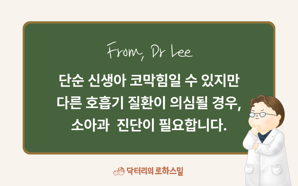 신생아의 콧구멍은 작기 때문에 숨을 쉴 때 코로 충분히 공기를 흡입하지 못해 그렁그렁 소리를 낼 수 있습니다. 이런 경우, 아기가 조금 자라면서 자연스럽게 좋아지며, 식염수를 사용해 코를 편하게 해주면 증상이 완화될 수 있습니다.