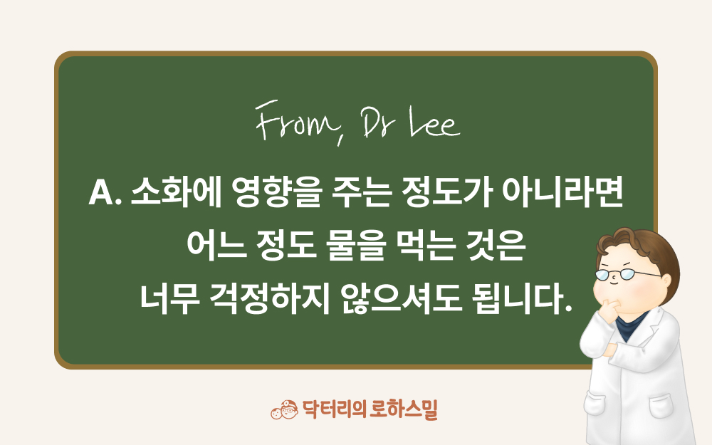안녕하세요? 식사 도중에 물을 마시는 것에 대해 어른들한테도 아직 의견이 분분하죠? 어떤 사람은 위액이 희석되서 소화에 도움이 안 된다, 또 어떤 사람은 상관 없다 등등. 사실 정해진 답은 아직 없습니다. 본인이 물을 먹는다고 소화에 지장이 생긴다고 느낄 정도가 아니라면 식습관에 따라 소량의 물은 먹어도, 안 먹어도 큰 문제가 없기 때문이죠.