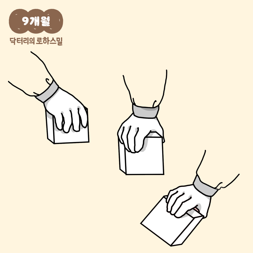 9개월의 아이들은 손바닥이 아닌 엄지와 다른 쪽 손가락 끝으로 작은 물체를 잡을 수 있습니다. 다른 쪽 손가락 끝이라는 것은 엄지와 검지를 이용하여 집게 모양으로 잡는 것은 아닙니다. 엄지와 검지를 이용하는 것은 조금 더 어려운 동작이에요.