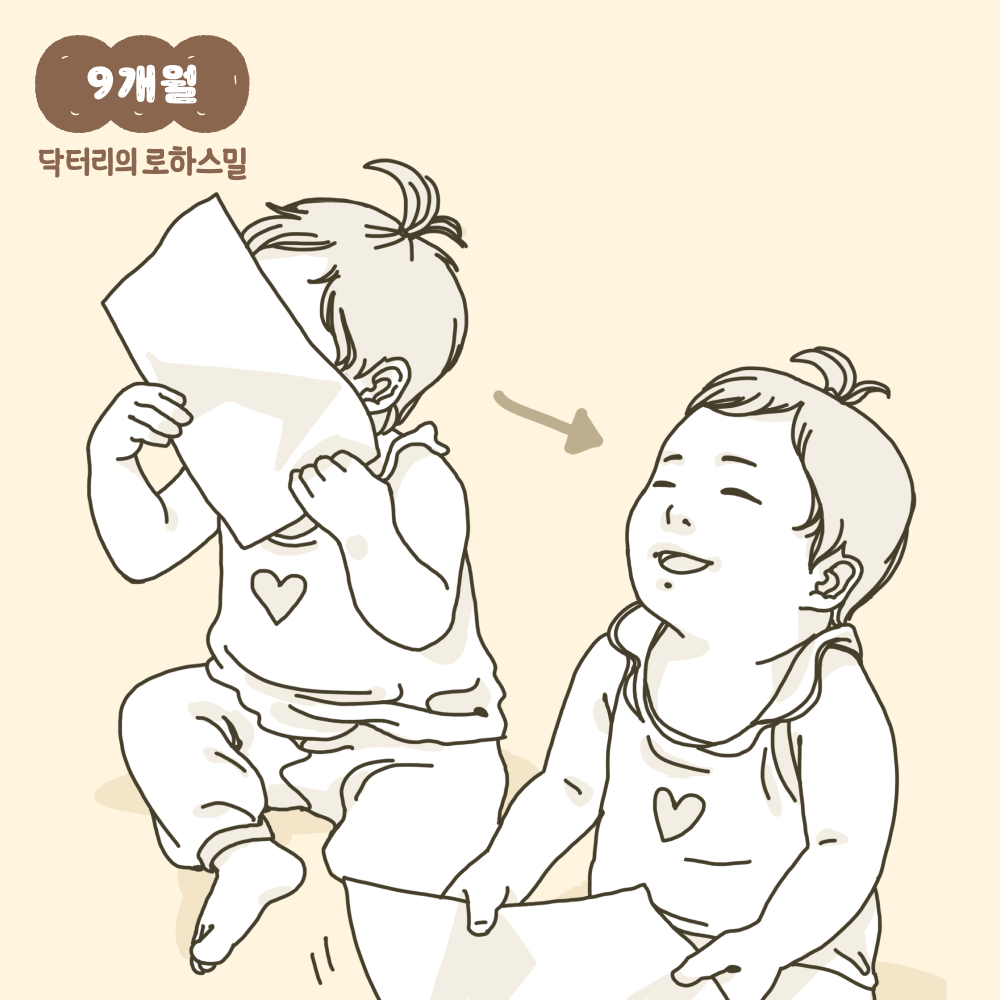 9개월의 아이들은 까꿍 놀이 등을 통해서 사물의 영속성을 배우게 됩니다. 까꿍하며 엄마의 얼굴을 가리고 있다가 나타나는 과정을 통하여 엄마가 보이지 않아도 그 자리에 있다는 것을 알아갑니다.