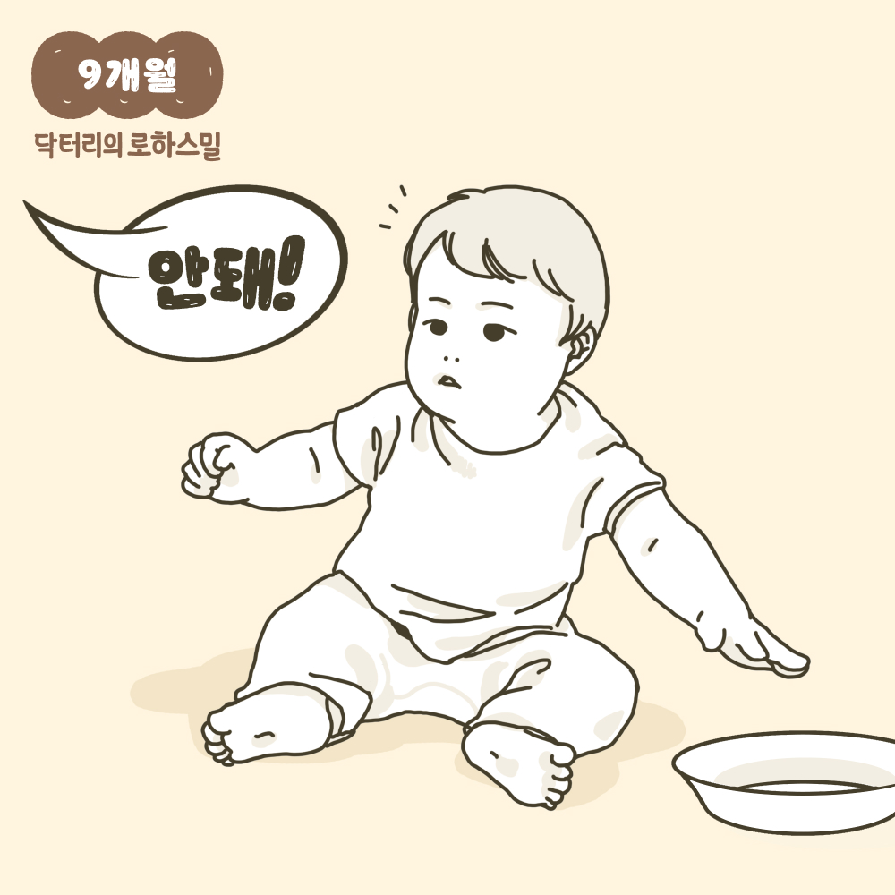 9개월의 아기들은 ‘안돼’라는 말에 반응합니다. 이 시기의 아기들은 자율성이 나타나 자신의 마음대로 행동하려고 하는 경우가 생깁니다. 훈육을 할 때는 단호하게 안된다는 것을 가르쳐 주어야 합니다.