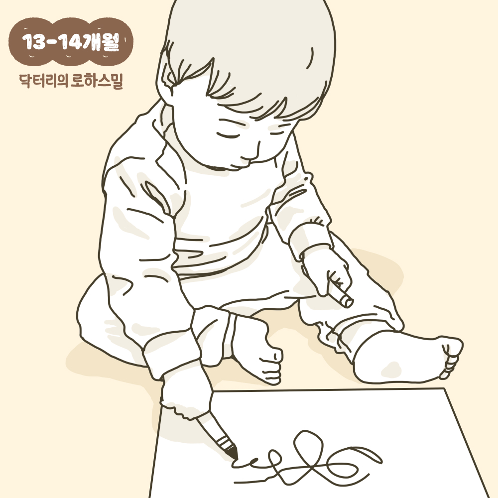 13-14개월의 아이들은 선을 이리저리 그릴 수 있습니다. 종이와 크레파스를 준비하여 아기가 그림을 그릴 수 있도록 도와주세요. 물론 입에 넣지는 않는지 잘 지켜보아야 합니다. 잘 그렸다고 칭찬해 주시는 것 잊지 마시구요.