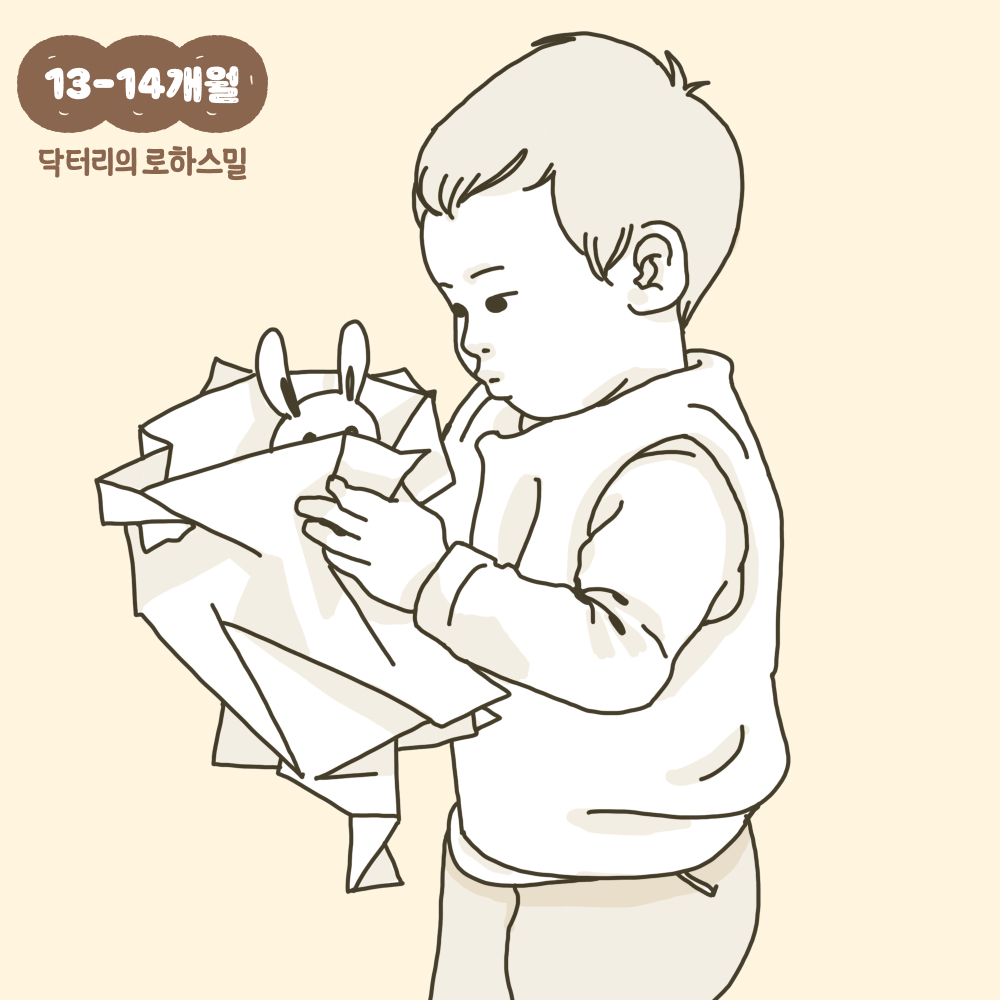 13-14개월의 아기들은 종이에 싸인 장난감을 찾을 수 있습니다. 까꿍 놀이와 마찬가지로 눈앞에 물체가 보이지 않아도 존재하고 있다는 대상 영속성을 알게되고, 손의 운동이 발달한 결과입니다.