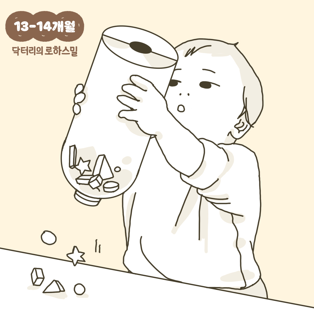 13-14개월의 아기들은 의도적으로 병 안의 물체를 뺄 수 있습니다. 과자등의 간식을 주둥이가 좁은 병(페트병)등에 넣고 간식을 찾아 먹는 놀이를 해보세요.