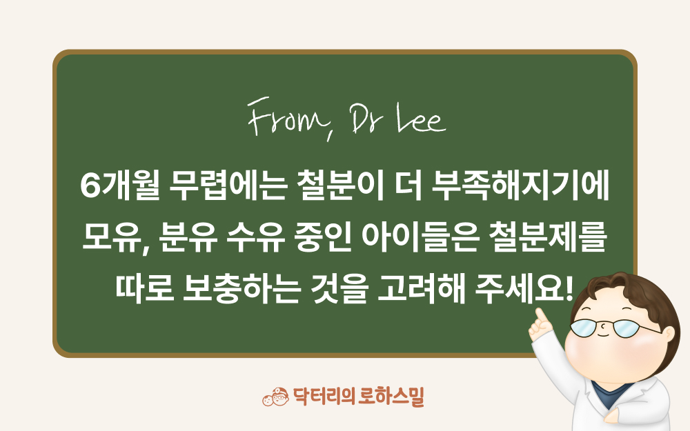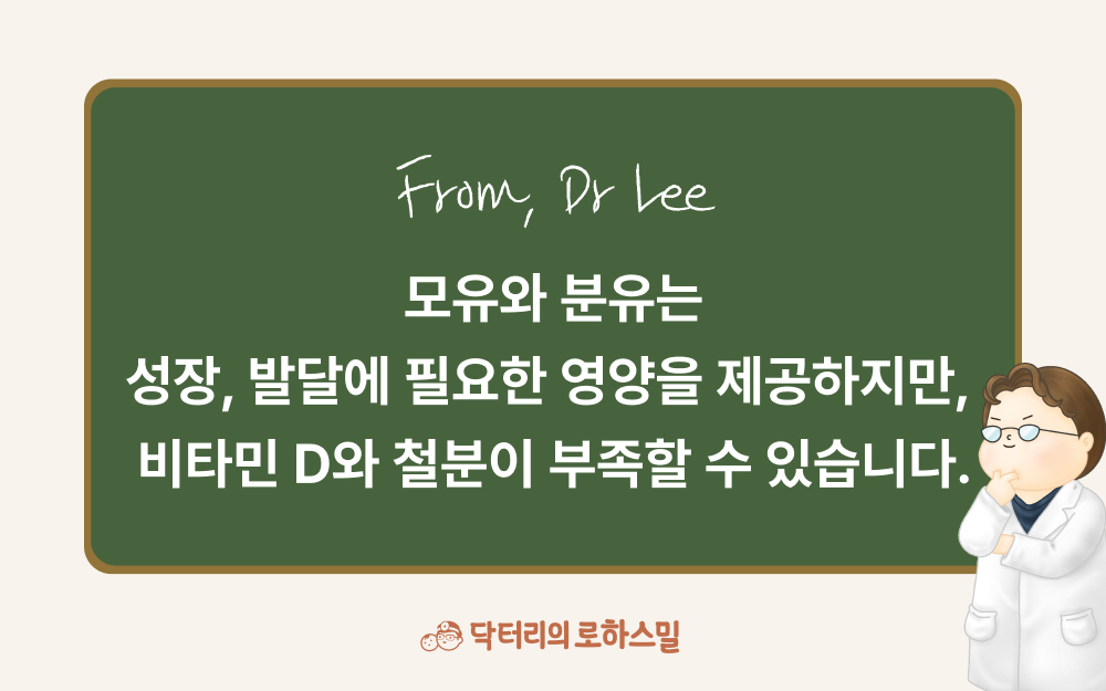 모유 수유의 가장 큰 장점 중 하나는 분유에는 없는 면역 성분(항체 등)을 공급한다는 점입니다. 그러나 비타민 D와 철분은 부족해지기 쉬우므로, 완전 모유수유를 하는 아기는 반드시 이 두 가지를 따로 보충해 주어야 합니다. 분유에는 어느 정도 비타민 D와 철분이 포함되어 있긴 하지만, 아기가 충분히 먹지 않는다면 분유수유 아기도 보충이 필요할 수 있습니다. 결국, 완전 모유수유 아기나 분유 섭취량이 적은 아기 모두 비타민 D와 철분 보충을 고려해 보시는 것이 좋습니다.