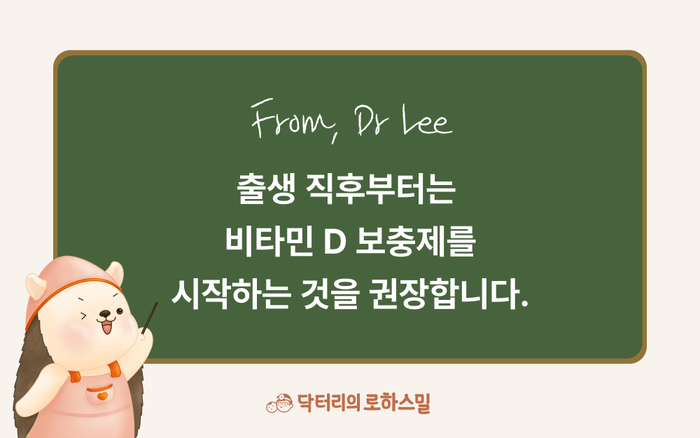 보통 비타민 D는 햇빛이나 식품(생선, 달걀, 유제품 등)을 통해 공급됩니다. 그러나 갓 태어난 아이는 주로 실내에서 지내고, 아직 이유식을 시작하지 않았기 때문에 쉽게 결핍될 수 있습니다. 그래서 충분한 섭취가 이루어질 때까지는 비타민 D 보충제를 따로 먹이시는 것이 좋습니다. 실제로 소아과 의사들은 대부분 출생 직후(늦어도 생후 2주)부터 비타민 D 보충제를 시작하도록 권장합니다.