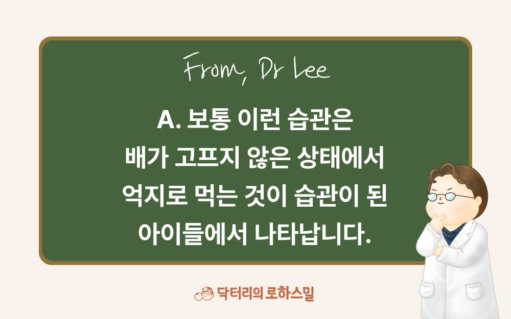 다만, 한 번에 딱 되는 건 기대하지 않는 게 좋습니다. 중간중간 아기랑 싸우는(?) 시간이 있을 수 있지만 마음이 약해지셔서 일관된 태도를 못 지키시면 그럴수록 더 고치는데 어렵게 될 거랍니다. 잠시 잘 못 먹더라도 장기간 이런 습관이 지속되는 것보다는 영양적으로 훨씬 이득이랍니다. 너무 마음 아파하지 마시고 올바른 식사습관을 가르쳐주도록 해주세요.